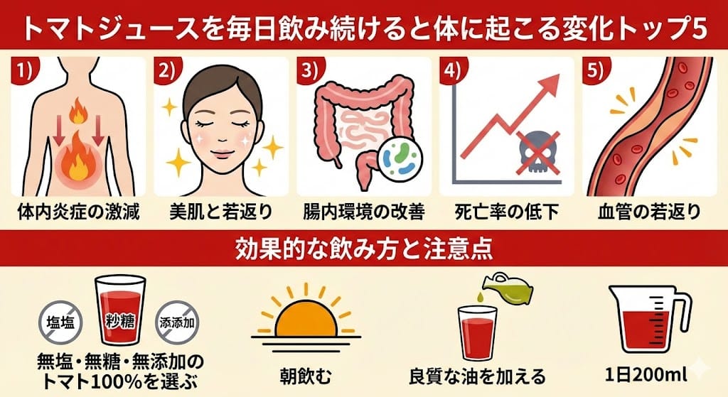 この5つのポイントを押さえるだけで、あなたの体は確実に変わっていきます。 特別な器具も、高額なサプリメントも必要ありません。今日、スーパーで1本のトマトジュースを手に取ることから、あなたの健康改革をスタートさせましょう。