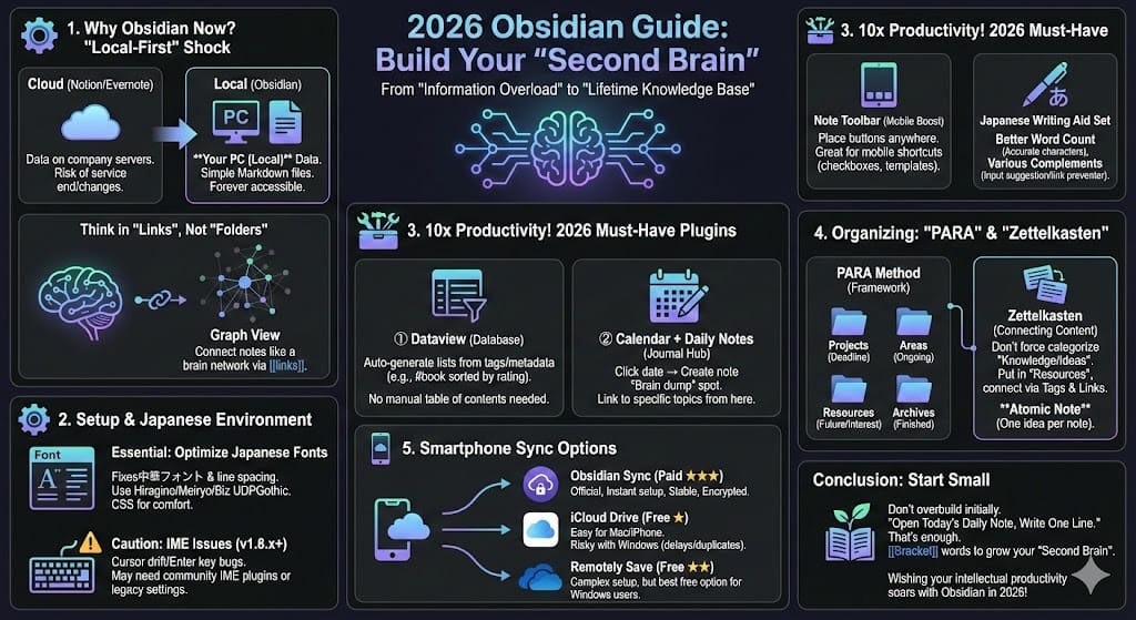 2026年現在、個人の知識管理(PKM)ツールとして圧倒的な支持を得ているObsidian。しかし、自由度が高すぎるがゆえに「何から始めればいいかわからない」という声も多く聞かれます。