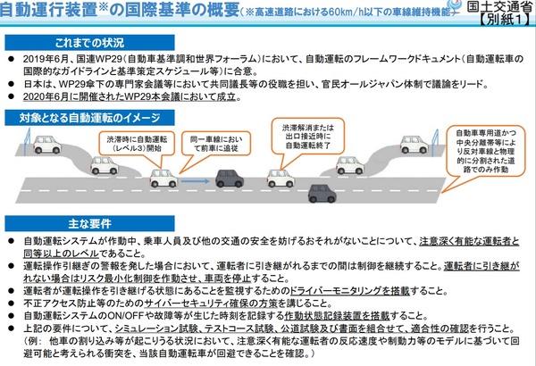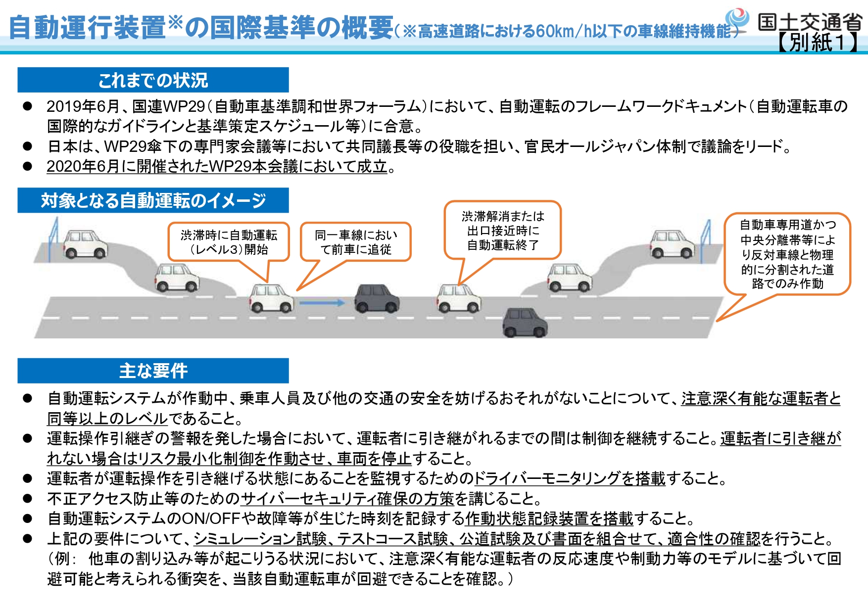 国交省、レベル3自動運行装置に関する国際基準の初成立を公表