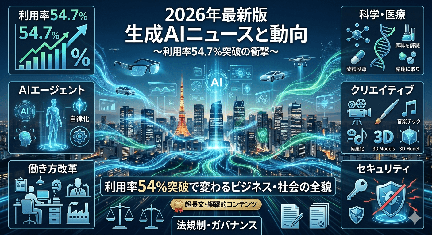 本記事では、2026年最新の生成AI動向から、実際の働き方への影響、ハードウェアやセキュリティの最前線、そして明日から実行すべき具体的なアクションプランまで、読者の皆様が抱える潜在的な疑問や不安を網羅的に解決します。表面的なトレンドの羅列ではなく、事実と具体的な事例に基づいた「辞書レベル」の深度で解説します。まずは、社会インフラとして定着したAIの現在地と、組織にもたらすリアルな変化から紐解いていきましょう。