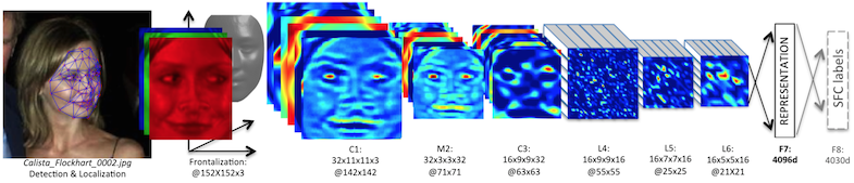 DeepFaceは画像内の顔から3Dモデリング技術で正面を向いた顔の画像を作り、これを1億2000万以上のパラメータを持つマルチレイヤーのデータにしてニューラルネットワークで共通ポイントを解析する。