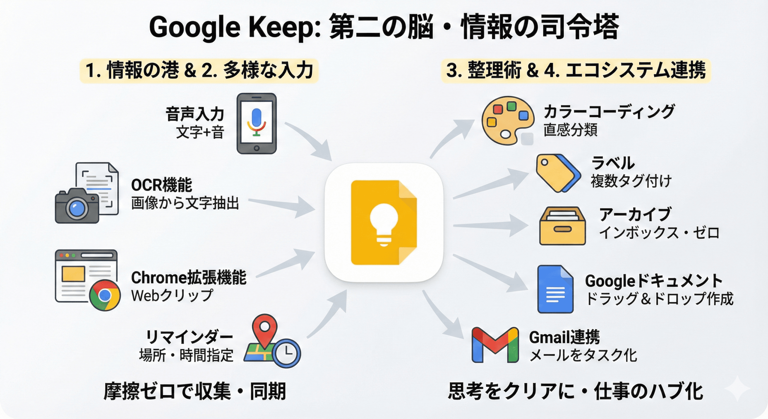 Google Keepはシンプルに見えて、裏側ではAIによる画像認識やクラウド同期など、高度な技術が動いています。しかし、使う私たちが意識すべきは**「いかに脳の負荷を減らすか」**だけです。