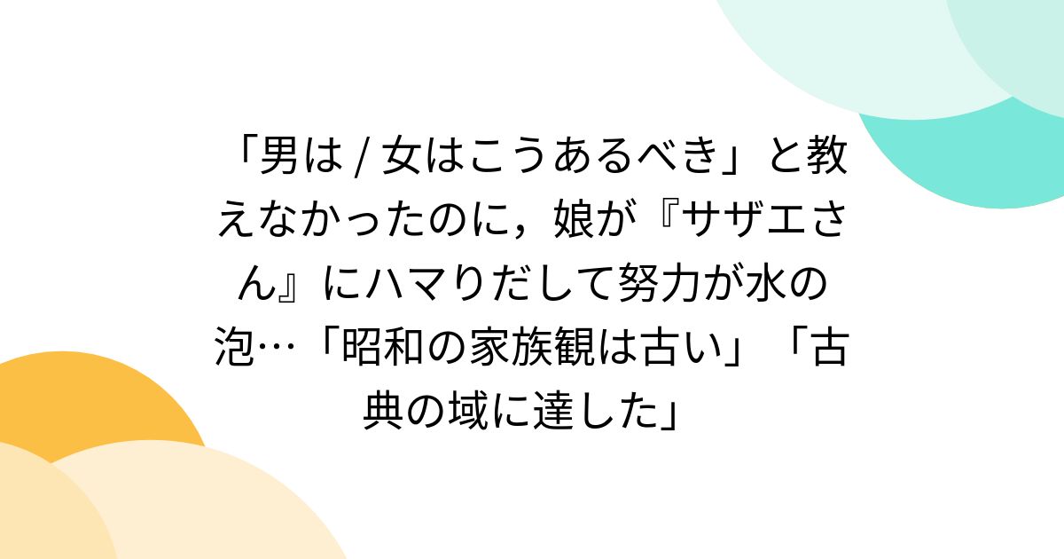 - 「男は / 女はこうあるべき」と教えなかったのに,娘が『サザエさん』にハマりだして努力が水の泡…「昭和の家族観は古い」「古典の域に達した」