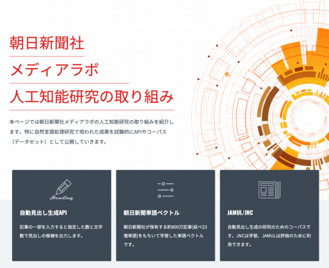 株式会社朝日新聞社(代表取締役社長: 渡辺雅隆)は、自然言語処理研究(注1)の成果の一つである「自動見出し生成」の機能を体験できるAPI(Application Programming Interface)を、評価用途に限って無償で公開しました。
