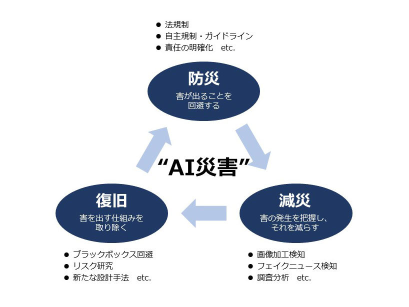 AIがもたらす不利益を「災害」とし、それに対抗する取り組みを(1)害が出ることを回避する「防災」、(2)害の発生を把握してそれを減らす「減災」、(3)害を出す仕組みを取り除く「復旧」――という3つの側面でまとめてみたい。